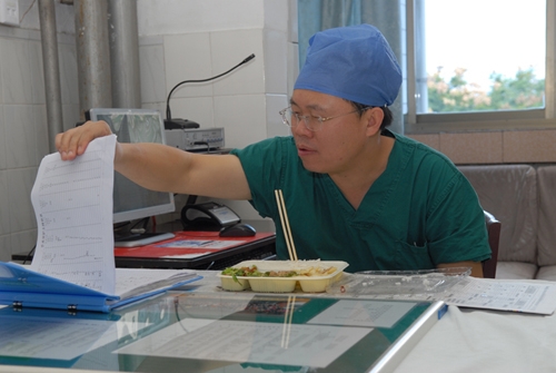趁著醫生準備第二臺手術,阿貴抽空吃了個午餐。午餐很簡單,一份食堂的盒飯,兩素一葷三兩飯。嚼一口飯的時間,他還不忘查看一下病人的病歷。吃飯時間10分鐘,如同鬧鐘般準時。