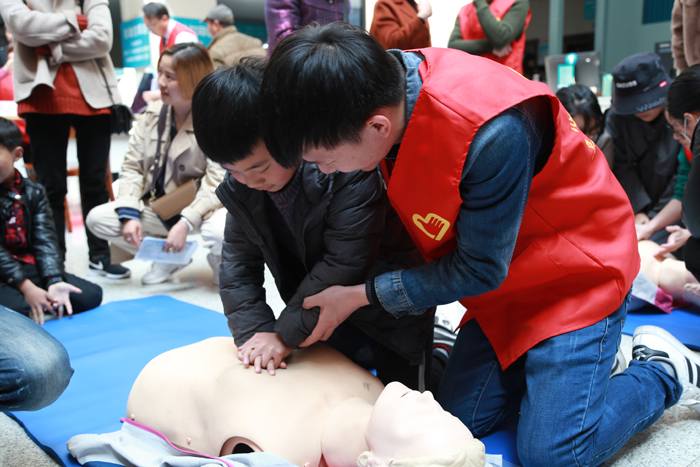 醫護人員為市民提供免費測量血壓、血糖和宣教服務。麻醉科主任蘭允平帶領醫護人員、志愿者,為在場的市民進行心肺復蘇術急救科普演練,并邀請他們在假人身上進行實際操作。