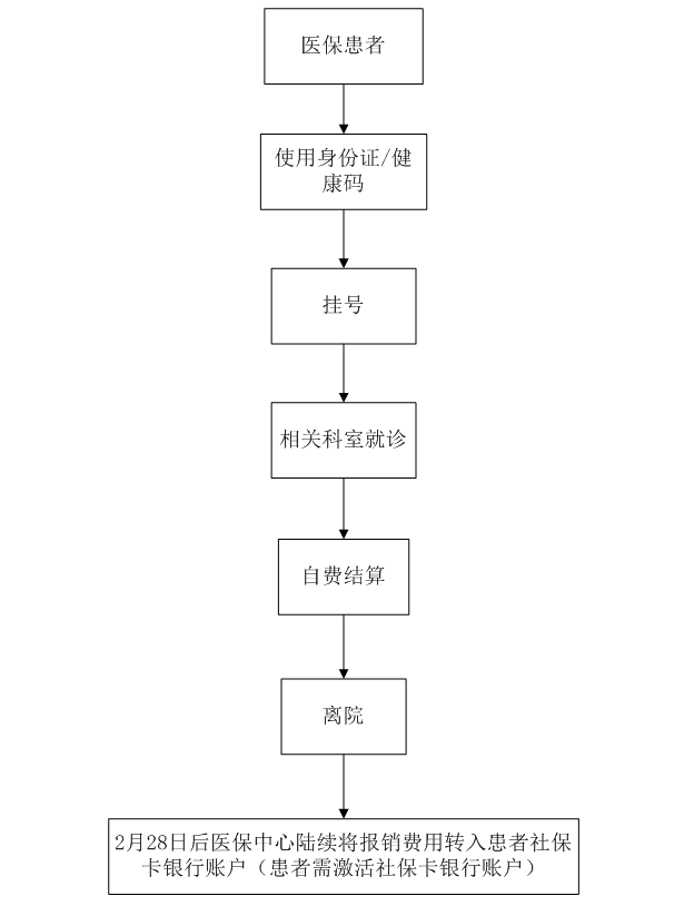 (二)門診醫保報銷。在本院發生的門診費用由患者先行墊付(自費結算),2022年2月28日起,各級醫保中心將主動發起報銷支付業務,將患者停機期間實際報銷費用直接支付至患者社??ㄣy行賬戶,患者無需再到窗口辦理人工報銷。