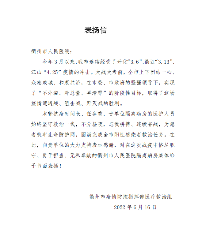 日前,我院收到了一封來自衢州市疫情防控指揮部醫療救治組的感謝信,為我院在此次疫情大考中忘我拼搏、主動擔當的精氣神點贊。